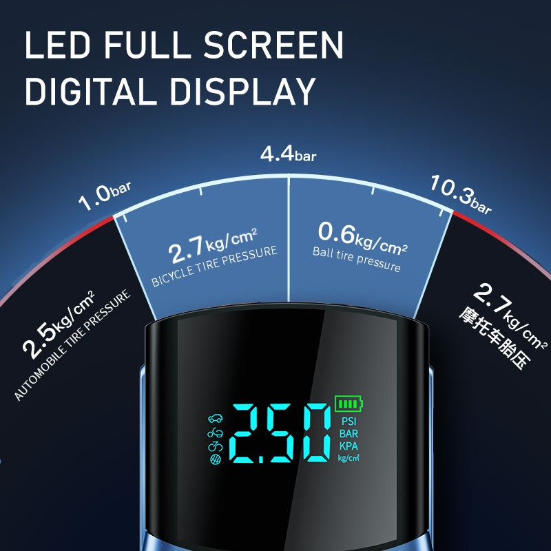 【4 in 1 Multifunction】: It is not only a portable jump starter, tire inflator, but also a portable power bank, LED flashlight for charging smartphones, tablets and other mobile devices. Supports USB 3.0 fast charging. Additionally, the built-in 300 lumen LED flashlight has 3 lighting modes: constant light, strobe light and SOS light.【Smart and 【Powerful Car Compressor】: Our mini car compressor is made with the unique Turbocharged movement, which is more powerful, more stable and less noisy. It can provide a maximum pressure of 150 PSI and air flow of 35L/Min, supports tire pressure detection, preset value stopping and unit switching (BAR/PSI/KPA).